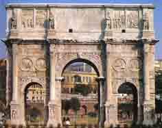 • 01 Konstantinsbogen Rom, 312/315. Der Ehrenbogen, 312 begonnen, vollendet 315 zur Feier des 10. Regierungsjubiläums Konstantins. Die Reliefs beziehen sich auf das Leben Konstantins (Wildschweinjagd). Werke aus Bauten Marc Aurels wurden verwendet, um die Reliefs zu schaffen. Die Physiognomie des Jägers wurde abgeschlagen und statt dessen mit einem Kopf Konstantins ergänzt. Der Austausch des Portraits ist Ausdruck der Macht Konstantins.